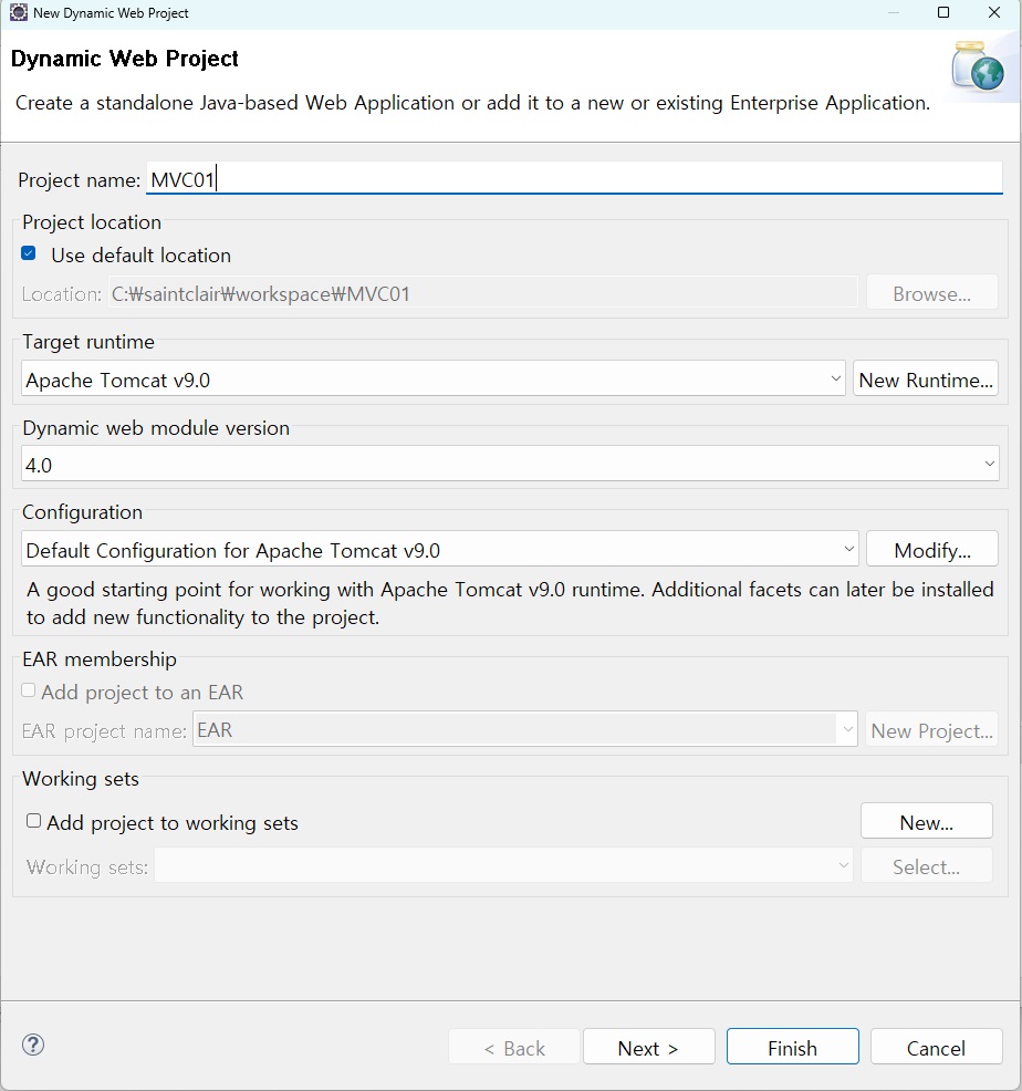 나는 초기설정을 해둬서 Target runtime란에 이미 톰캣으로 설정되어 있다.