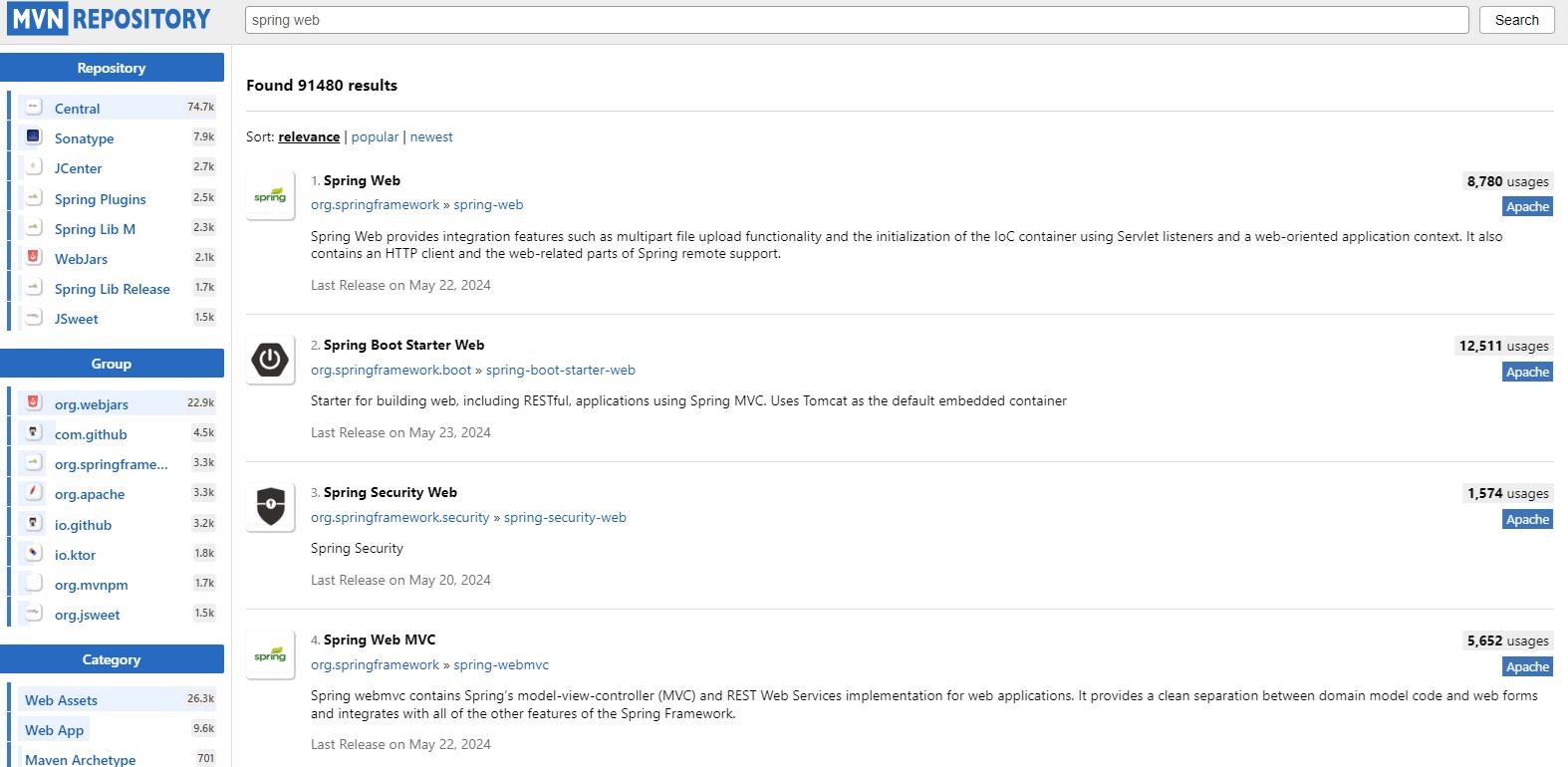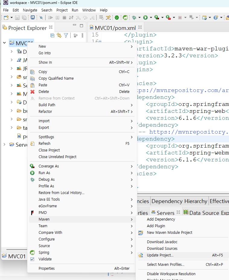 Spring Web과 Spring Web MVC를 클릭해 복사해서 pom.xml 파일에 붙여넣으면 된다.