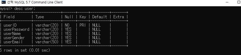 우리가 만든 user 테이블 안에 어떤 속성들이 들어가 있는지 확인