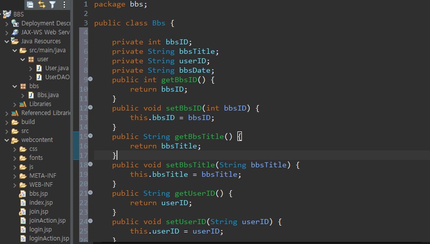 Bbs 클래스 생성(JavaBeans) - 게시글 하나를 관리할 수 있도록 하는 하나의 프로그램이 됨