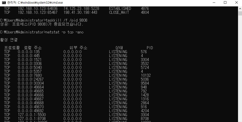 다시 netstat -p tcp -ano 입력해서 연결된 포트 확인