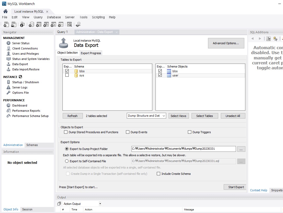Export to Dump Project Folder 테이블 별로 내보낼지